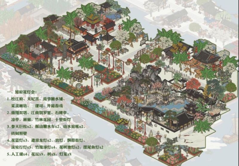 2.集市、鱼摊、望火楼、围屏观戏、杂物摊、飘带街灯、花树地灯、小花园、雪羊羔