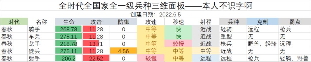 我特意又查看了一下它的一级兵和三级兵种,确实是这样的。春秋时代的一级徒兵有防御,但三级徒兵就没有防御了。
