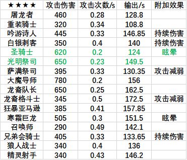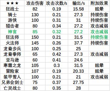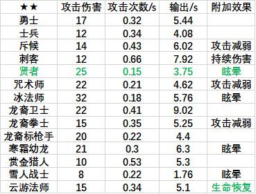 表格中兵种以及数据为绿色,表示该兵种用于回血,没有攻击力,数据为生命恢复数据