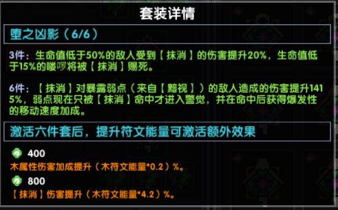 开启紫色技能【黯视】时,靠近敌方将会给其施加“弱点”当敌方处于弱点状态时,抹消对其造成的伤害提升1415%(现在弱点只能在被抹消命中后才会重新刷新)命中弱点状态的敌人后会获得爆发性移速加成(也就是获得短暂的5.0移速)