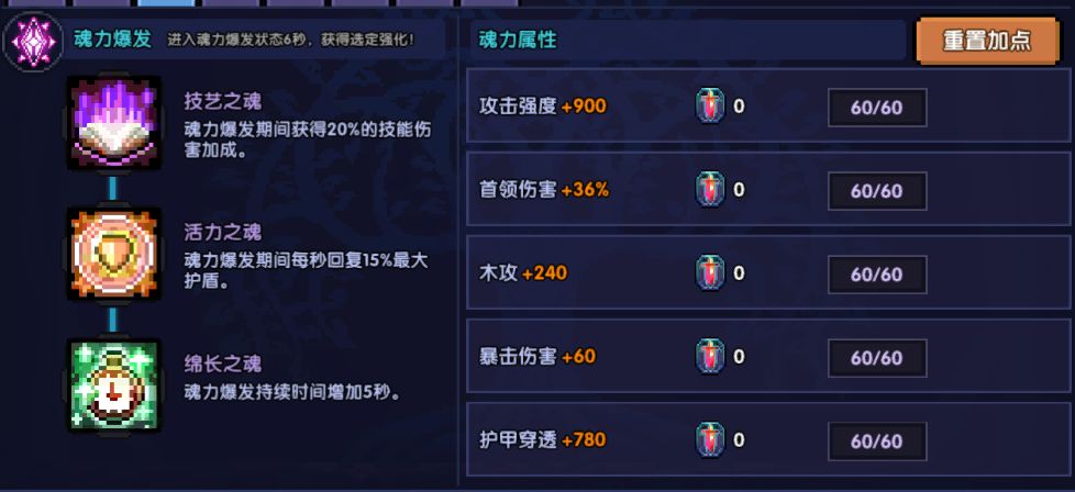 魂力爆发选择强攻之魂,因为全伤数值高,前期没什么稀释,带着用就完了