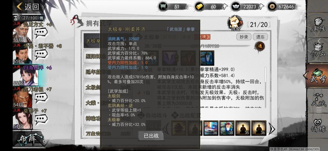 4.玩太极拳内力必须要阴阳调和,这样可以叠加太极拳和剑的反击率,叠满有200%反击率。