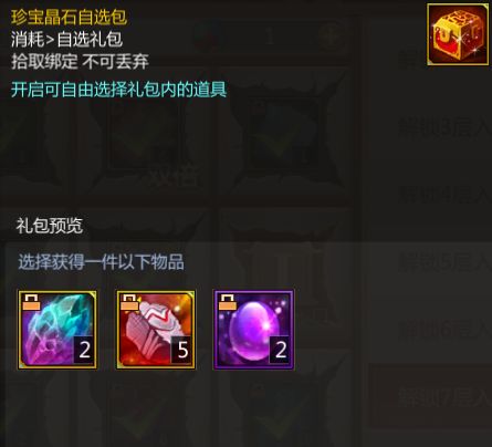 解锁3层入口即可获得珍宝晶石自选包*2,可从麒麟石、凤血石、高级梦之精元中任选一件获得。