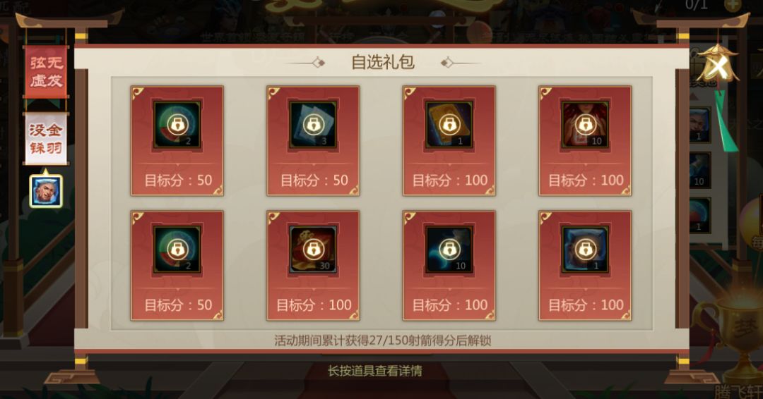 注意哦,没金铩羽中的奖励需要累计150射箭得分后才可解锁。