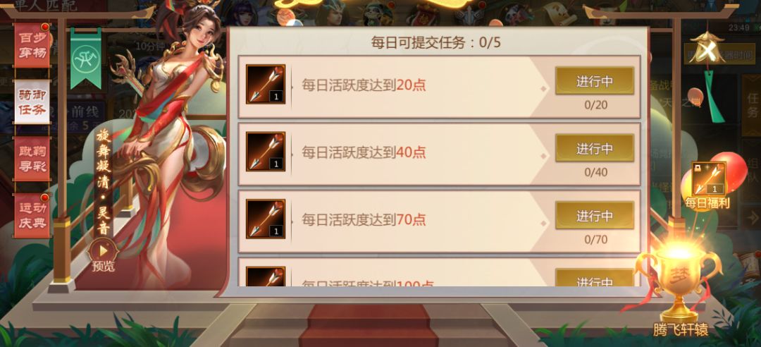 2、骑御任务:完成骑御任务可获得箭矢奖励,骑御任务每日重置。每日可提交5个骑御任务,提交满后当天无法继续提交。