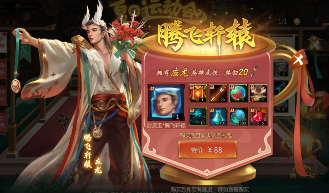在之前的爆料中,梦梦给大家介绍过全新英雄应龙的换装腾飞轩辕,在这次的夏日运动会开启后,大家可以在活动的主界面中购买腾飞轩辕礼包获取这款全新换装。