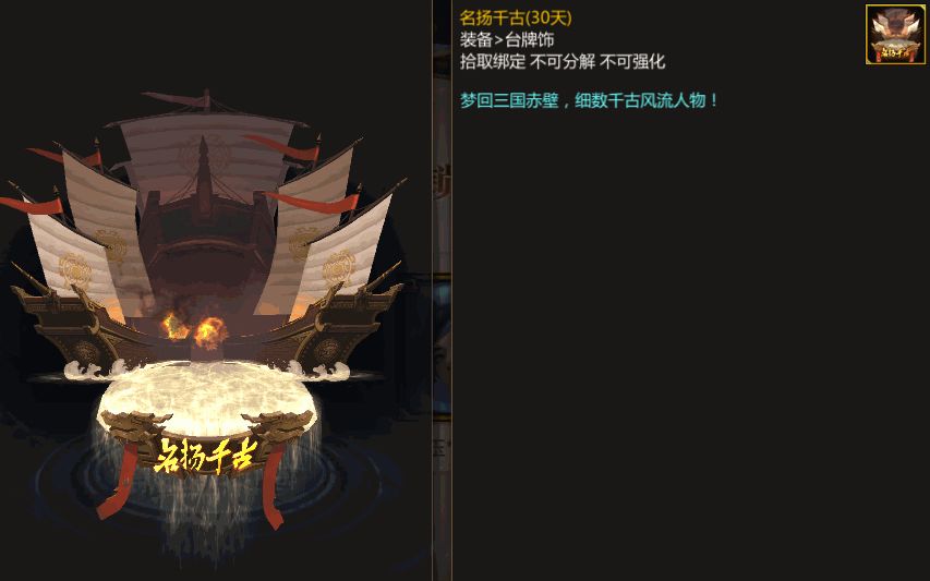 除此之外,礼包中还有一个台牌饰—名扬千古。带你梦回三国赤壁,细数千古风流人物。