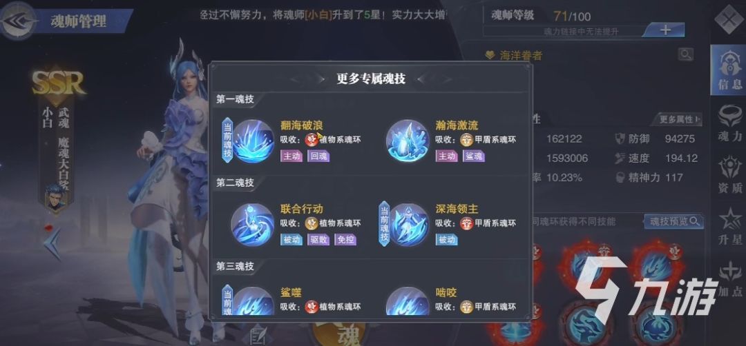 1技能纵权勇击:为植物系的奥义魂技,能使队友进入海神圣谕状态,在该状态下队友的群体伤害会提高百分之二十,最高四层。