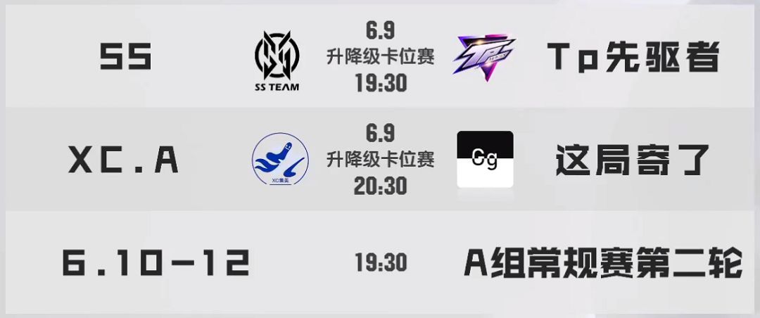 至此,首轮循环赛圆满收官,S组和A组最终进入升降级赛的队伍分别为“XC.A”、“SS”、“Tp先驱者”以及“这局寄了”四支车队!他们将在6月9日为大家上演一场更加精彩的升降级大战,让我们拭目以待!