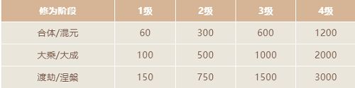 5.以下为合体/混元、大乘/大成、渡劫/涅槃阶段,每级精炼所需要的补天玉数量:
