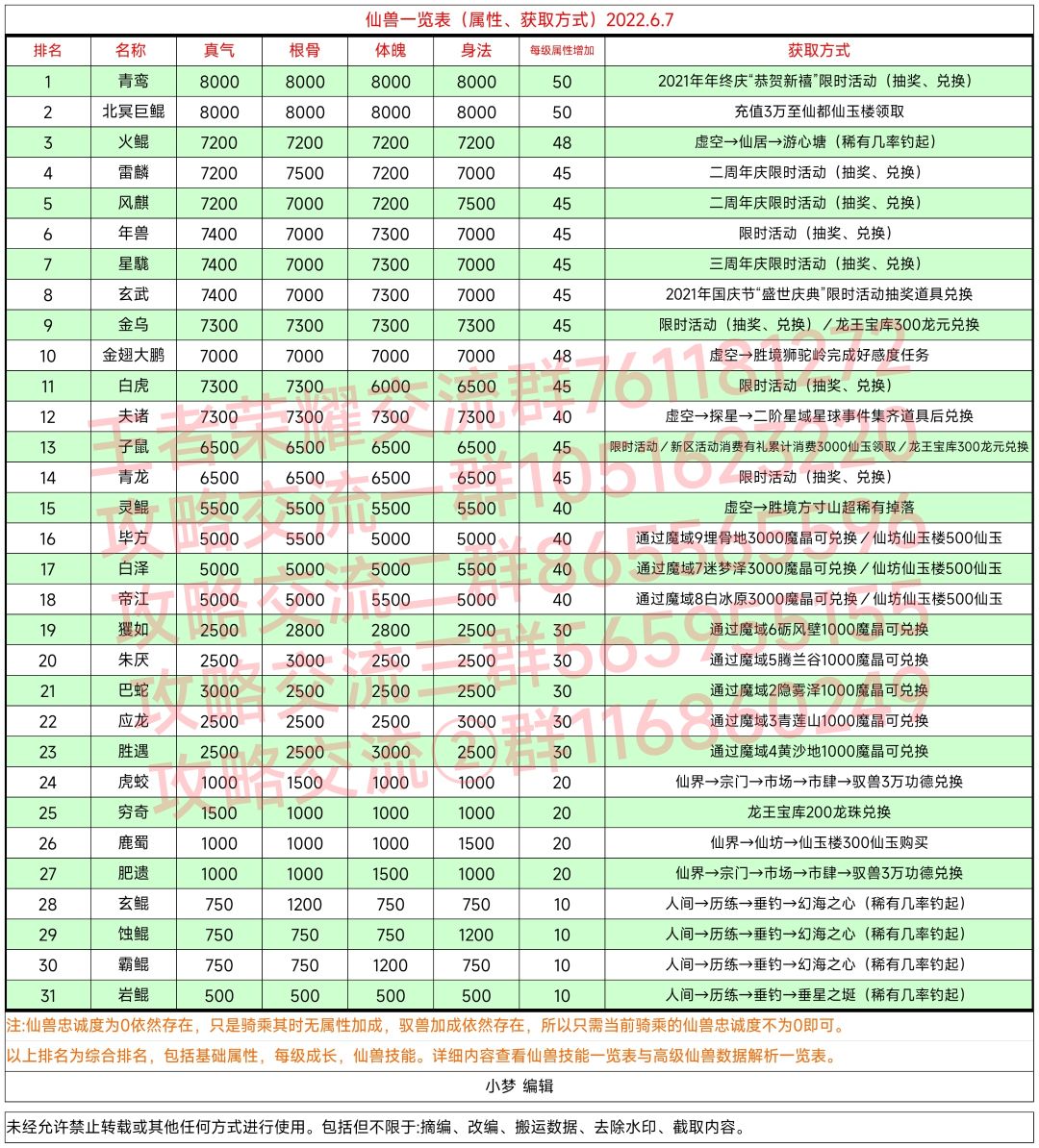 ①仙兽(属性、获取方式)一览表 ②仙兽技能一览表 ③仙兽数据解析一览表 2022.6.7