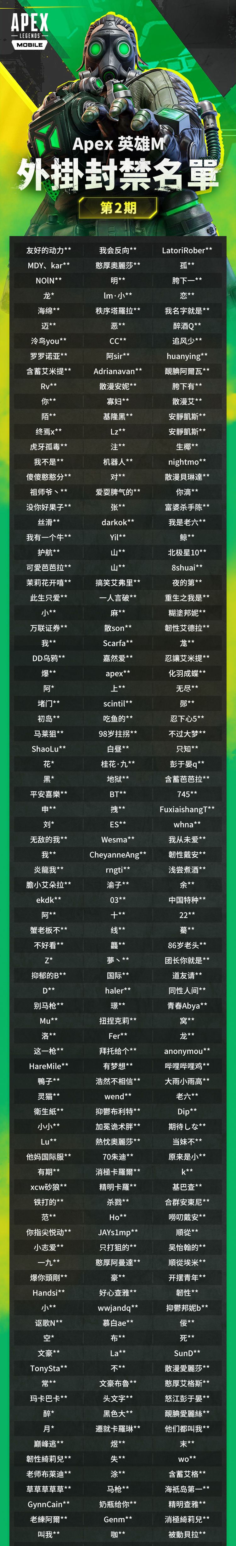 Apex 英雄M官方社交媒体(「Apex 英雄M」公众号 & Facebook 公共主页)近期更新了第二期港澳台服外挂封禁名单,正文如下: