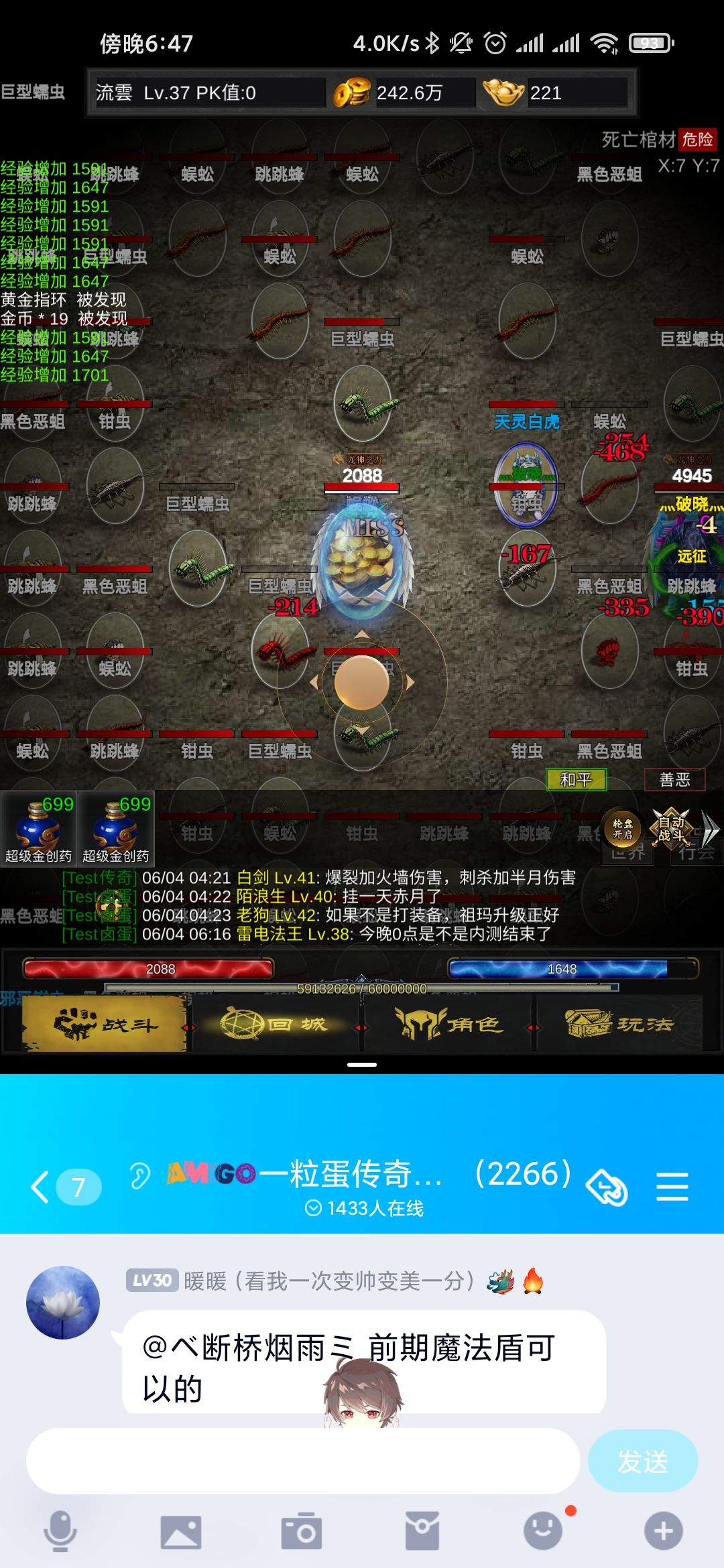 升级30之后可以尝试一下危险图。到35以后不要着急加工会 先看排行榜的大佬创工会没有 跟着大佬混奖励。每周日晚上9点攻沙给大量道具奖励。36级可以混世界BOSS 可以混装备 再就是挖矿尽量挑人少的时候挖 避免抢矿 矿物带来的好处远超你想象,就比如升级护盾所需要的金刚石和精炼装备的金矿石和铁矿石。所以懂得都懂,不懂的记住一点挖矿没坏处。说到护盾就牵扯到技能了 内测结束时 技能只能装5个 而且好像不能卡技能了,所以前期打书页也是重点。 优先挂尸王打书页主要先升护盾,因为 只有站得住才有输出,因为前期伤害有限 只能靠磨血 当你遇见BOSS时 ,你就会发现啥是血条蹦迪了。所以防御和护盾你是优先处理的,关于合成装备要35级才能一键合成 前面处理徽章会出现麻烦尽量手动。(沃玛套可以留着设置那里调22就行)。到40之后就可以打装备了 我个人建议还是42之后再去打 因为40级你的防御还是不够的 别杠除非你是大神 42可以混42的世界BOSS和攻沙。记住42级才能攻沙哦!40级之后别忙着转生 因为转生会掉等级弥补经验差的,而且还会因为你攻击不够导致你一时间打怪效率不够 这样你就会错过很多世界BOSS和活动图。反正就一句话前面升级 加群看大佬分享的心得 和谐游戏 多看 多学。有啥bug和联系上交管理人员就行。最后祝你游戏愉快我是流云 期待游戏中与你相遇。