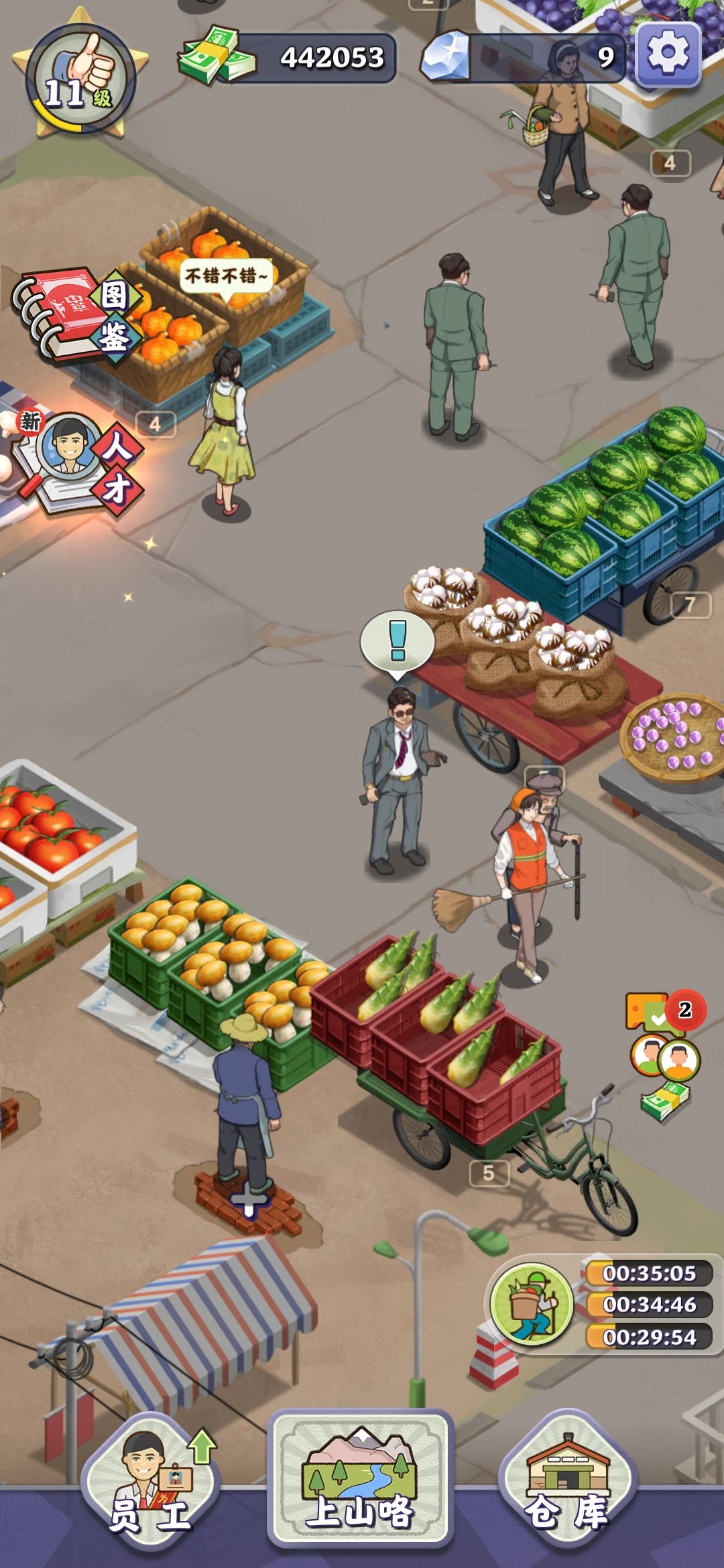 集市进门会有个长期收购贩,橘黄色图标就是收集完成了,淡黄色是未收集满。每天凌晨刷新可以提交山货可以获得钱💰➕钻石💎或小红花🌸,多交一定次数上限就只有获得钱💰➕小红花的奖励了。