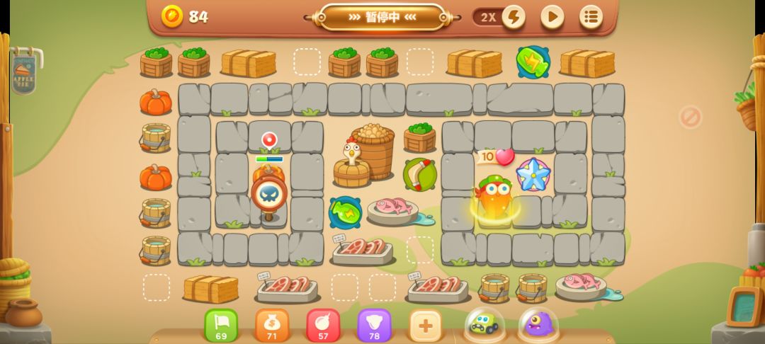 先在右上角放个瓶子,把下面的南瓜打开,放一个满级冰星,然后清理中间鸡下面的南瓜。