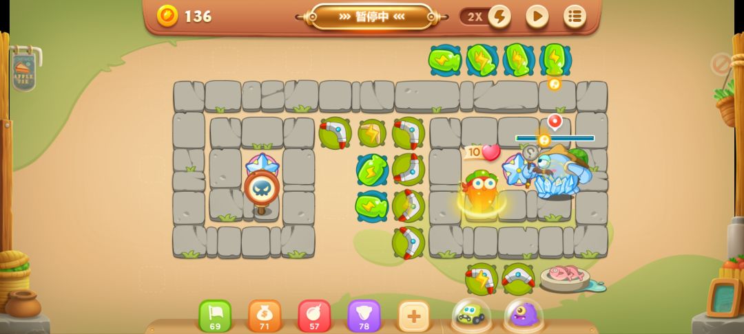 主要往中间部位瓶子放正中间,回旋镖放两旁,右上角全放瓶子,锁定BOSS集中打。至于左边的障碍物,在最左下角放一个瓶子慢慢清理,超出攻击范围就把瓶子卖了再往近处放一个瓶子。