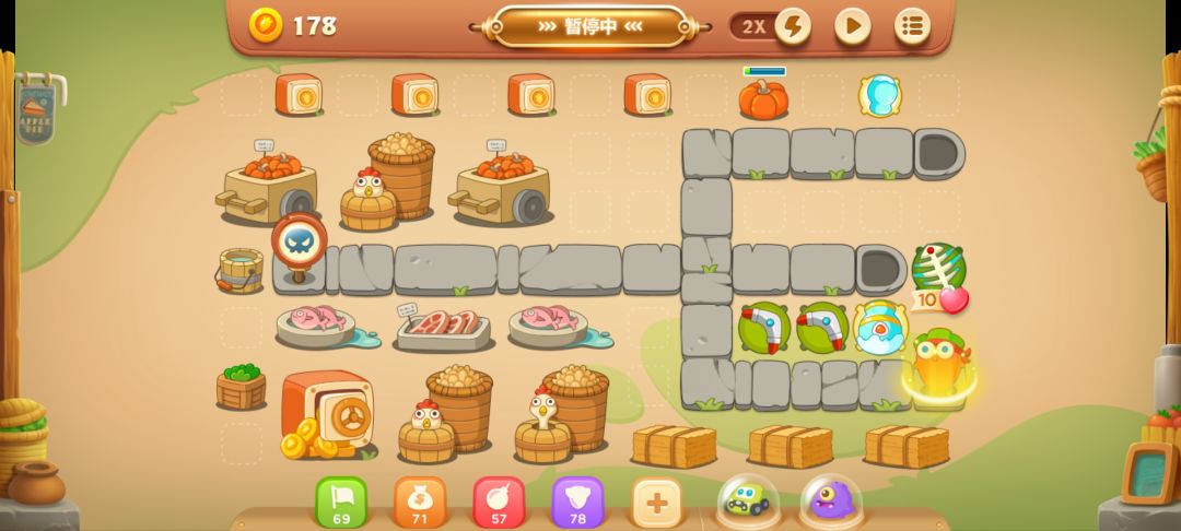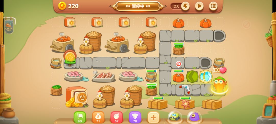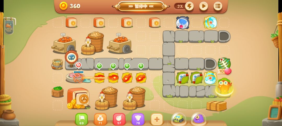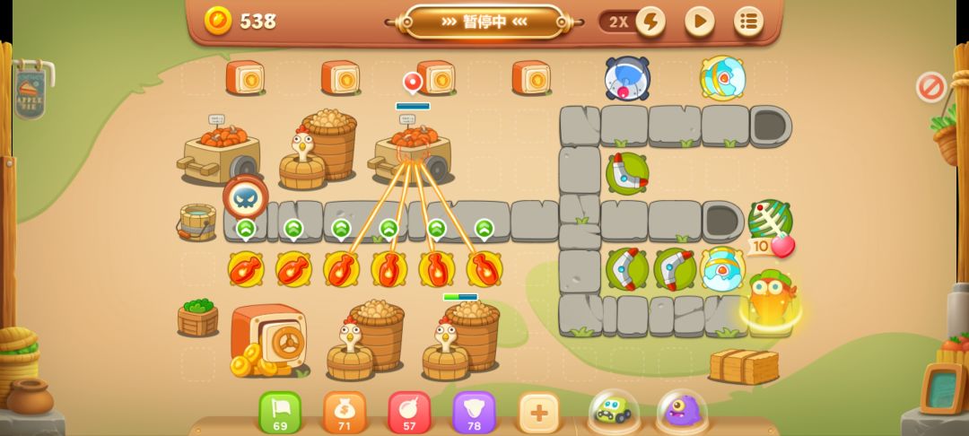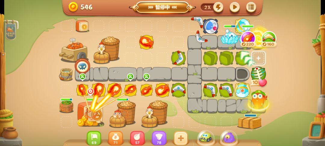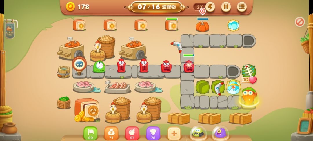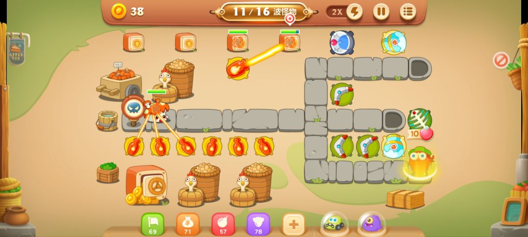 这里放个满级回旋镖,开旁边的南瓜,有隐藏的减速炮,不用管第一波怪,炮开出来再打也行。