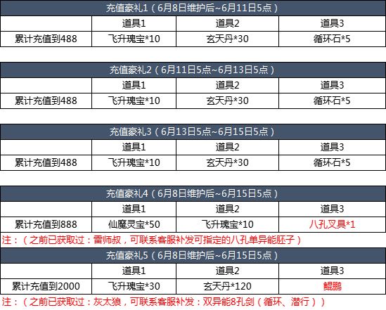 3、2000充值豪礼:如不需要鲲鹏,可联系客服补发可指定的八孔双异能胚子/灵兽*灰太狼/功法*化龙诀/功法*兽神诀