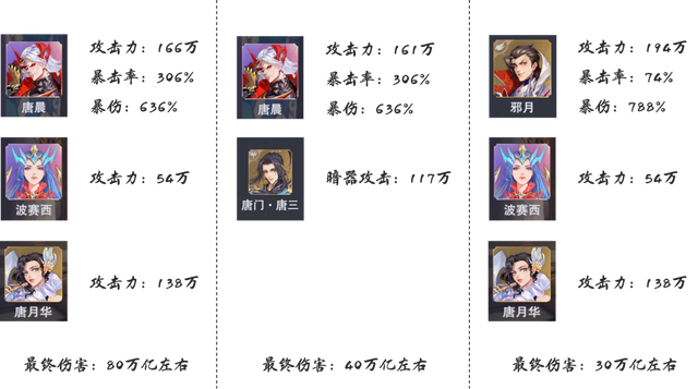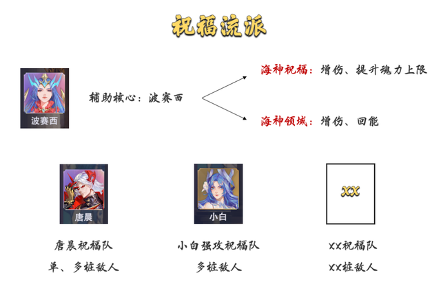 而在目前游戏中的祝福流派玩法就太多太多了,比较主流的便是普通的敏攻祝福队和携带小白的强攻祝福队,而敏攻祝福队中无疑是以唐晨为核心,而且由于单体伤害过于夸张,在面对多桩敌人的时候唐晨祝福队也是不遑多让;而以小白为核心的强攻系祝福队其实目前的表现已经要好多了,因为随着波赛西、唐月华、绛珠等辅助魂师练度的提升,祝福流的上限也在慢慢提升,而强攻系魂师虽然在唐晨面前依然显得有些不堪一击,但未来的强攻系SP上线后,一切应该都会有所改变。相对之下,祝福流玩法的伤害则更多取决于:输出魂师的攻击力、暴击率和暴伤、波赛西攻击力、唐月华攻击力(重点)、绛珠攻击力、其余增伤魂师这里维一需要给大家针对增伤魂师的增伤技能做个小小的普及,在主动增伤技能中,其实可以细分为按照目标魂师或按照施加魂师属性百分比为基础两类,例如鬼魅的4-1技能【幽火冥照】,火舞的4-1技能【火舞耀阳】都是典型的按照目标魂师的攻击力进行加攻的增伤技能,而这类技能是可以作用于暗器攻击的;相反例如唐月华的2-2技能【礼乐】中的【甄】,宁风致的1-1技能【七宝玲珑心】中的加攻效果则是按照唐月华和宁风致的攻击百分比进行增伤的,而这类增伤技能则无法作用于暗器伤害,这点区别维一先在这里讲明白。
