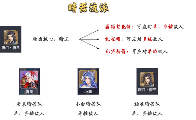 首先目前游戏中的暗器长图打法大概就3类阵容和5个细分玩法,其分别是唐晨暗器队、小白暗器队和标准暗器队,而唐晨暗器队和标准暗器队都可以细分为【暴雨梨花针】和【孔雀翎】的单桩或多桩打法,所以是3类阵容和5个细分玩法。而在这5个细分阵容中,拥有红4星以上的唐晨肯定是单桩和多桩的王者,600%的记录值爆炸伤害足以可让搭配暴雨或孔雀的唐晨成为暗器队中的王者,而不足红色4星的唐晨暴雨暗器队在和高配小白暗器队(袖箭红4星,孔雀红4星,阎王帖红4星、小白专属魂骨6星)的竞争中也会略逊一筹,最后暗器队中较弱的则是标准暴雨/孔雀暗器队。而上面3类阵容和5个细分玩法的伤害更多取决于:唐晨暴雨/孔雀暗器队:唐晨星级、唐晨暴击率、唐晨暴伤、暗三攻击力、暴雨或孔雀星级、追魂夺命胆星级、其余增伤魂师强度等小白暗器队:小白专属魂骨是否6星、袖箭星级、孔雀星级、阎王帖星级、暗三攻击力、暗三暴伤、其余增伤魂师强度等标准暗器队:暗三攻击力、暗三暴伤、暴雨/孔雀星级、其余增伤魂师强度等所以想要提升各类暗器队伍的伤害,我们便可按照上述的说明去进行有的放矢的投资,那么说完了暗器队,我们再来简单看下祝福流派: