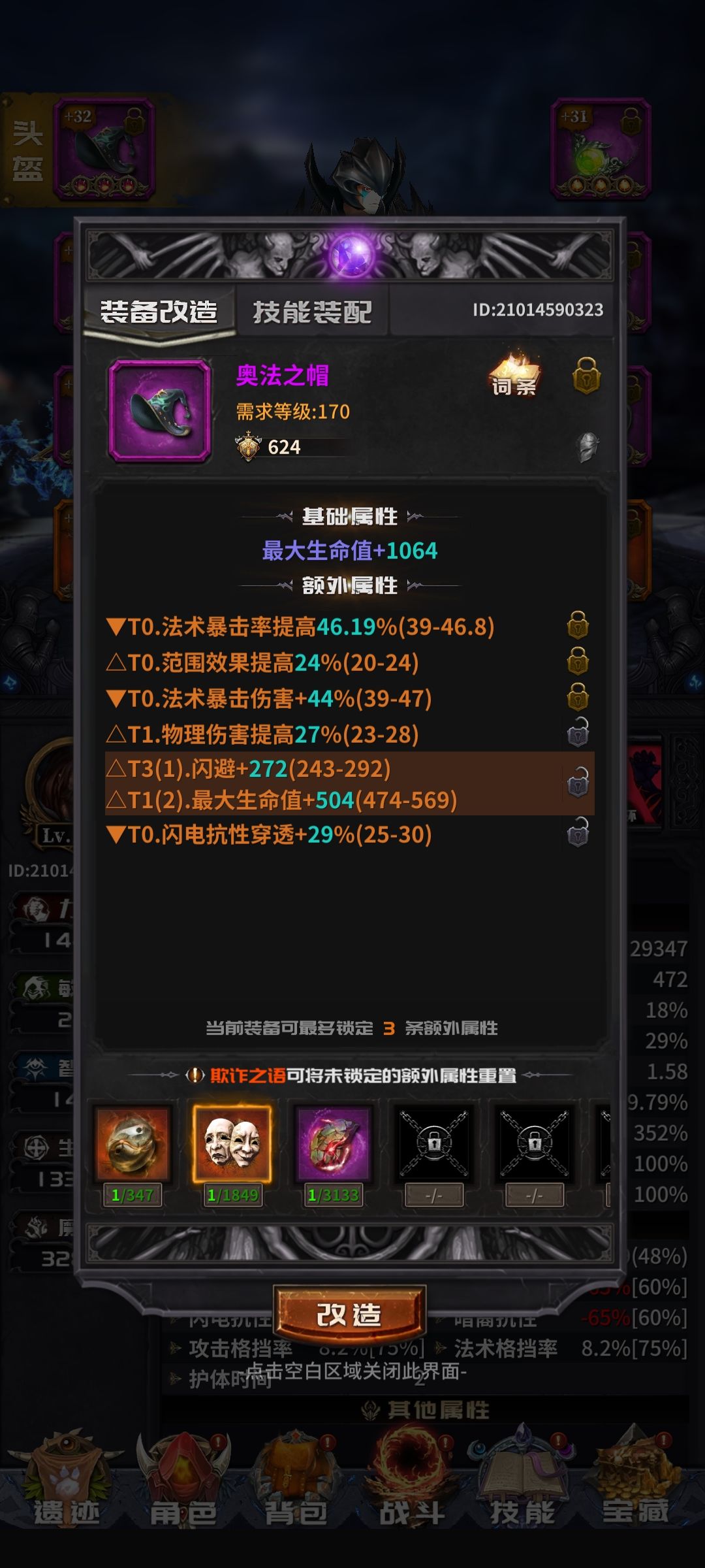 头盔:核心词缀:法术暴击率提高,范围效果提高,法术爆伤提高。候选词条:闪电抗性穿透。建议三锁出一。