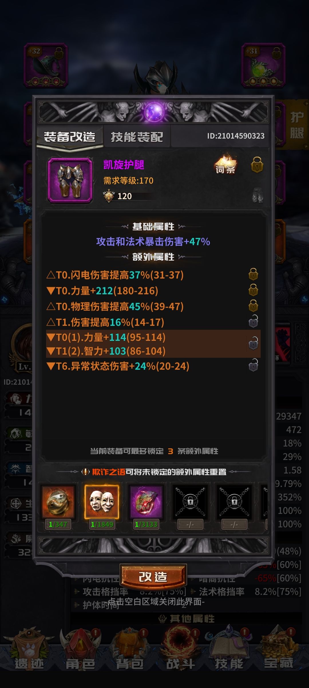 护腿:核心词缀:力量提高,物理伤害提高。候选词条:闪电伤害提高,可选词条:伤害提高,闪避提高,元素抗性提高。