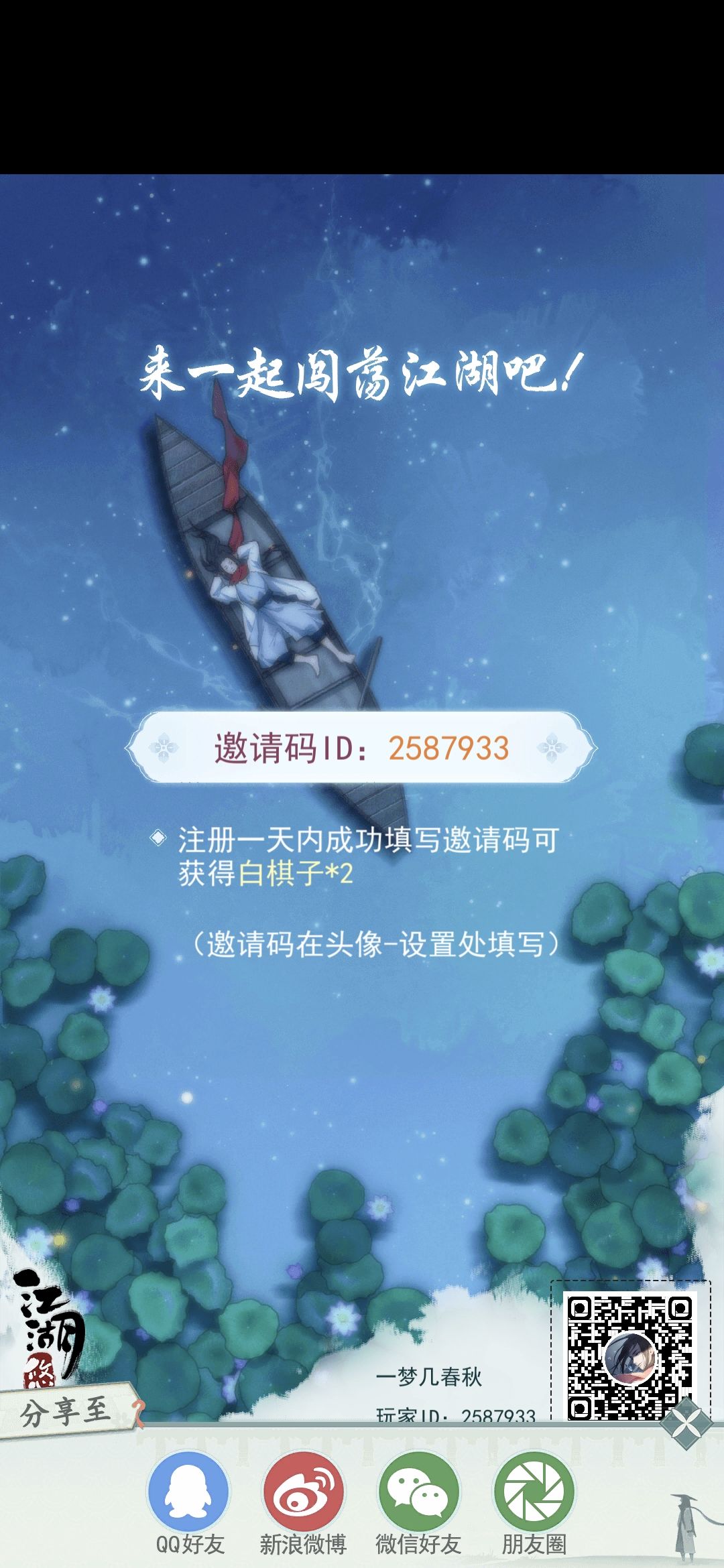 1.进入游戏2级后,点击头像设置—兑换码—输入邀请码 2587933 可领两颗白棋子,可以攒起来抽上品武学!建议棋子多存一些再抽,因为有三倍武学机制,每个人有55次三倍武学的次数 !