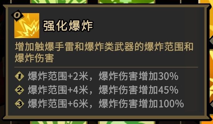满级+6米的爆炸半径+100%爆炸伤害,让你体验秒全图的快感,加上武器词条“+2米爆炸范围,+15%幸运一击”和虎炮本身的范围,基本可以覆盖第一章boss房的1/4面积,相当残暴。建议1-1就获得,第一章之内点满。