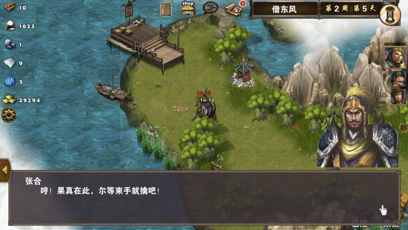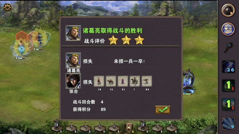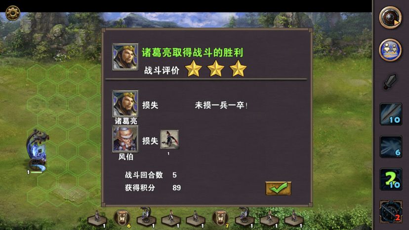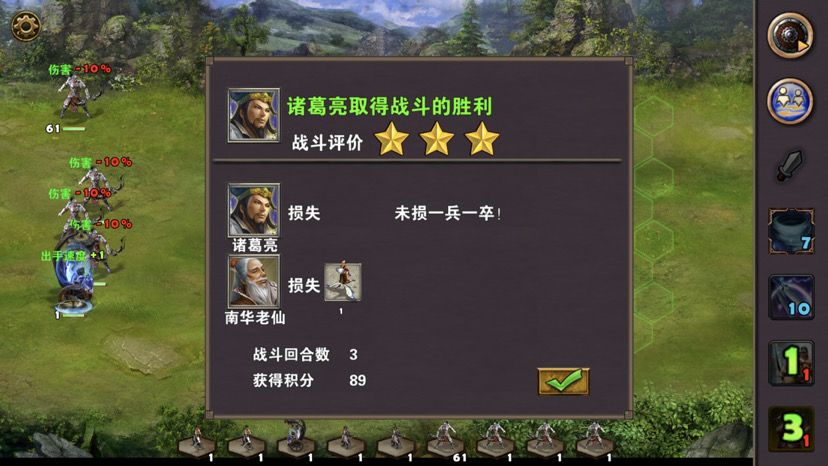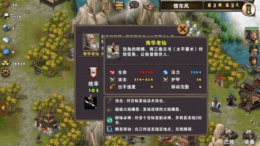 首先查看三星过关条件(3周4天内通关地图,并在挑战过程中获得8次三星战斗评价),如果有太史慈,这关没难度,太史慈配鹰卫无脑射,就完事,只是我没有金币买太史慈,所以只能使用免费英雄甘宁辅佐战斗,3周的时间也招不了多少兵,所以就使用鹰卫吧,战术卡使用准备就绪、战前准备或者火箭,搭配两张资源卡炼金术、木工术,开局诸葛亮把三个小兵扔了往右走访问哨塔、向上打小怪访问神像,然后回头把图上小怪和资源清理一遍,注意中间有个老者对话可以触发任务,左边有个无主之城可以占领,差不多2周左右吧曹操会派两个手下boss在水里拦截,可以不用管他们,下水后往左上走码头上岸,凉亭旁边有组小怪数量很多,基本上很多时候都是远程兵种,诸葛亮首回合晕对面,然后甘宁二回合一直贴身对面使其无法攻击,轻松打掉小怪,访问凉亭,左边有口水井可以回蓝,暂时先不用,如果可以看见右边徐庶把路堵了,上前对话徐庶加入队伍,前面一点有个水车可以访问,水车上面有朵花,这个就是任务耐冬花,上前取了,然后打右边风伯,风伯有点小强,不过还是不敌我们三位英雄的围攻,打完风伯,张合出现,张合必须打,躲不开,不然下不了码头,过去访问水井,过天,张合主动攻击,三位英雄轻松打掉张合,加上之前的战斗,8次三星战斗评价轻松搞定。注意这段时间别忘记两个城池招兵,只需要招募神射手就可以,其他不需要,如果回到初始地图对话老者完成任务,这个时候应该是3周了,去城里把神射手拿了升级鹰卫,把鹰卫分三个出来,一个一组,去打南华老仙,南华老仙技能打人有点疼,不过还是不敌我们这么多人的围攻,打败南华后轻松三星过关,附视频、截图