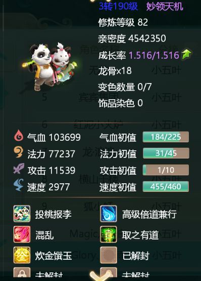 小五叶优秀的敏血初值和觉醒技能,使之成为完美的卡敏召唤兽。2转135级,血量可以达到14W速度440;3转190的小五叶,可以达到50W以上的血量,速度在1300左右,不论是首发抗伤回拉还是闪隐出来补给,血量和速度都是恰到好处的。