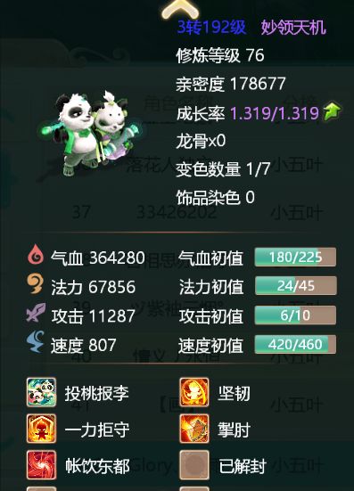 培养打造:小五叶自身是八开特殊召唤兽,在常规开格子打技能外,我们可以利用“小五叶碎片”兑换聚魄丹、高级技能书、龙骨和神兽丹,对平民玩家来说减轻了不少打造的费用。方向1:中敏首发血卡敏技能搭配:高血、一力拒守、纵横四海、吉人天相、遗产等坐骑搭配:血系三坐骑,天神护体、移宫换羽、身如铁石都是不错的选择;佩饰装备:气血百分比、抗仙法、抗人法为主,强化技能选择加强遗产、强化吉人。抗性加点:抗混、遗忘(PK抗冰)、抗仙法物理等;