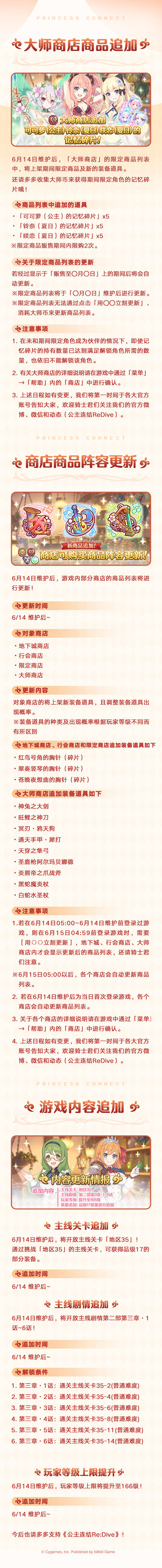 维护结束后,新角色★3「祈梨」(CV:藤田茜)即将登场!游戏内将同时开启「祈梨」精选扭蛋;同时,公会之家将限时复刻花束主题家具,回忆留声机将追加新的背景音乐;部分商店商品阵容将进行更新;大师商店将上架新的商品道具,并追加新的游戏内容!