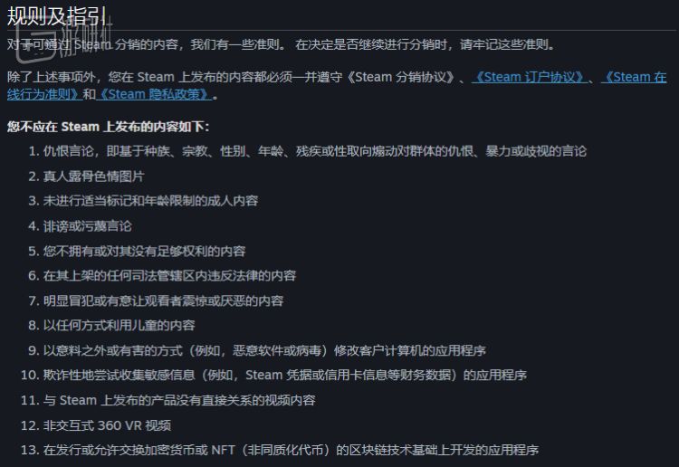 自2021年10月起,Steam平台的分销政策多了一条内容,禁止玩家上架任何基于区块链技术基础上开发的程序。现有的游戏不得出现加密货币或NFT(非同质化代币)要素,否则必须立刻下架。