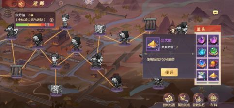 注:小还丹,拯救平民后有就用;大还丹,有拯救的武将时使用,忘忧散减疲劳值(不做300疲劳时有就使用),幻神丹提供专武建议优先给蔡文姬,总体上来说就是道具有需要就及时使用,开箱子经常扣血,或是降低火后注意使用道具回复。