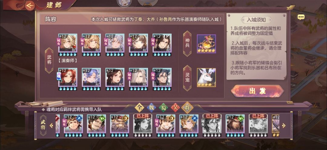 这种需要持续作战的活动奶量和生存必须得到保证,所以我首选女团作为开局阵容,演奏师会占据队伍一个位置了,值得注意的是需要一并带上马云禄,不然丹翎孙尚香的龙魂羁绊无法激活。