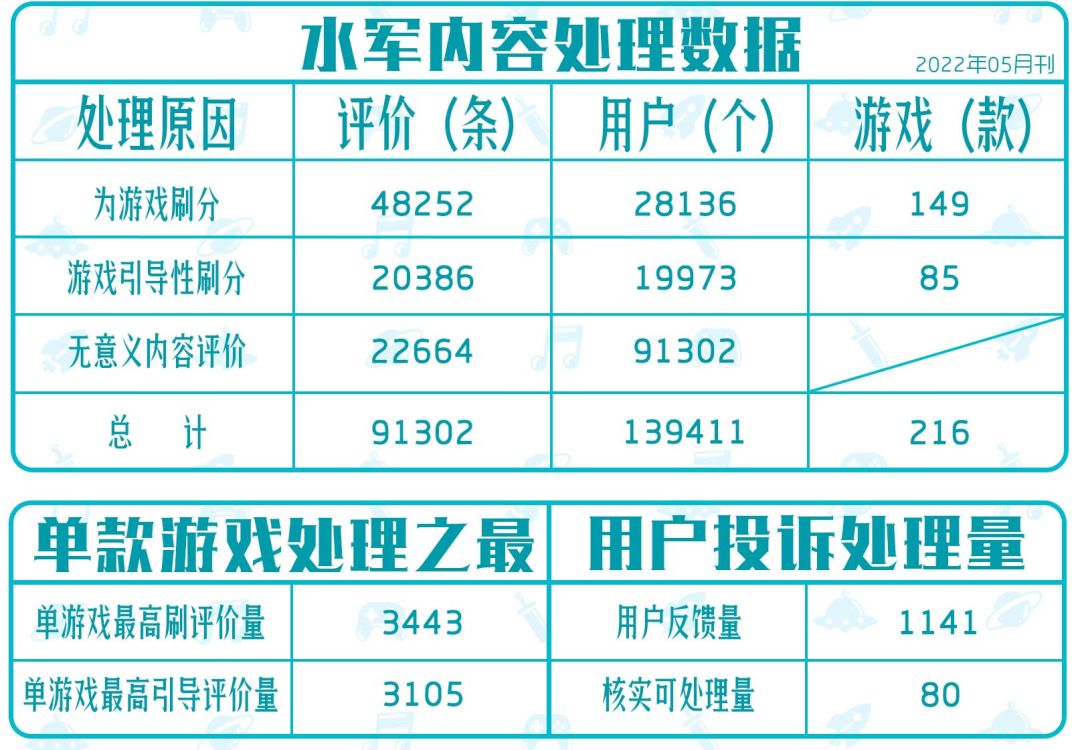 本月水军评价共处理91302条,处理了有刷分行为的游戏共216款。收到用户总反馈量为1141条,核实后可以处理的数量为80。