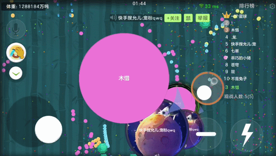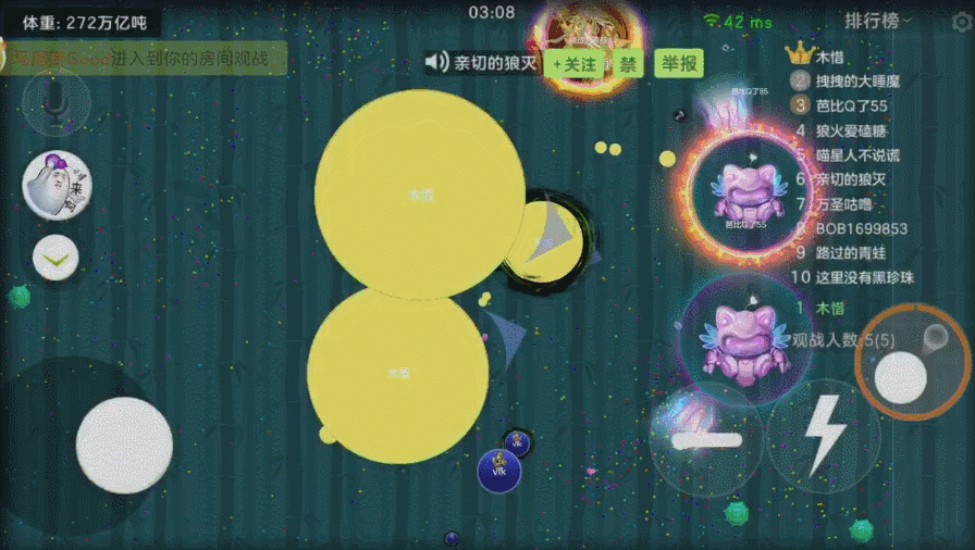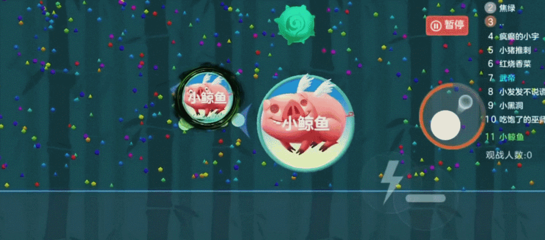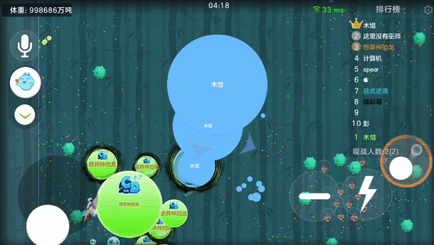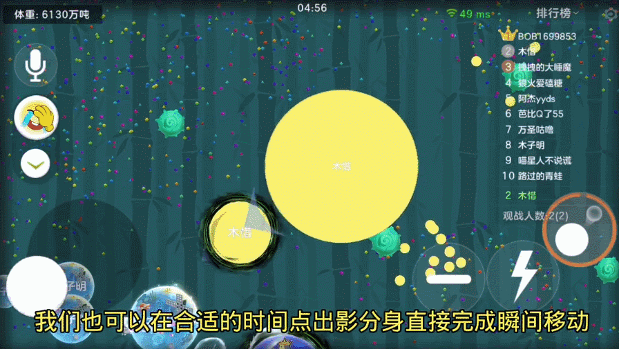 点击影分身按钮,会出现影球,影球不会影响我们的移动、吐孢子和分身操作,状态持续7秒,我们最多拥有16个影球,加上普通球一共可以32分身,简直妙不可言~