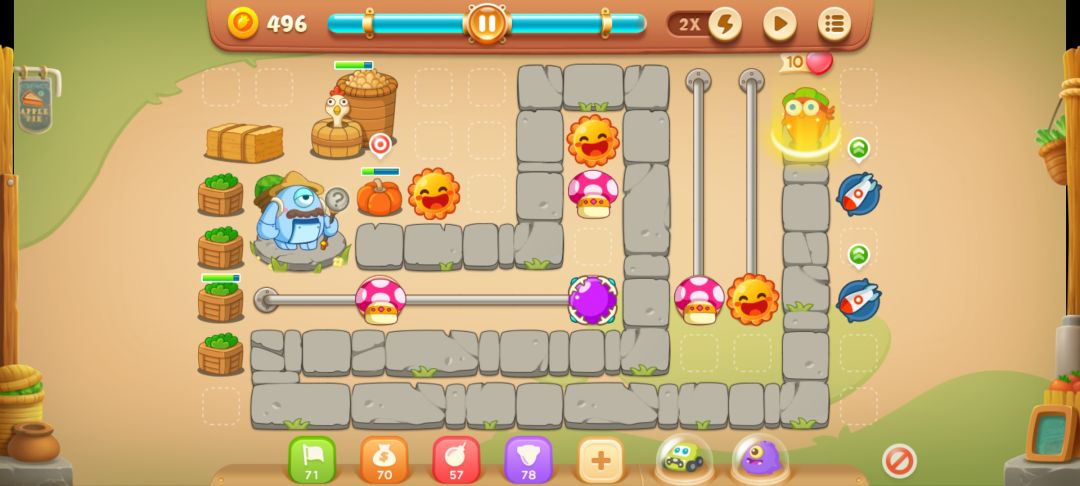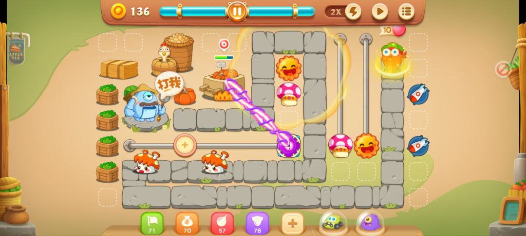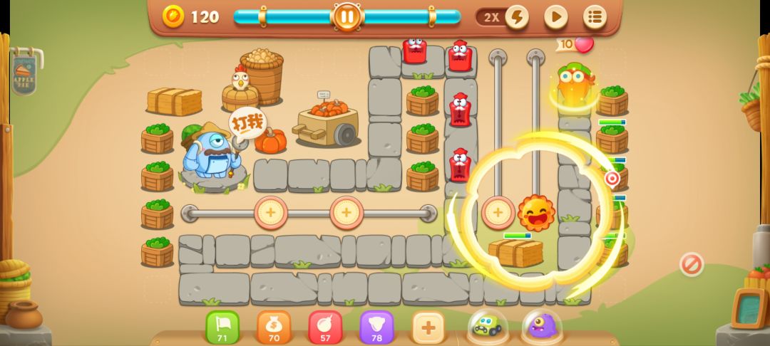 摆成这样基本就差不多了,要注意跑得快的怪,有速度快的怪就不要锁定BOSS,先打小怪,不然金萝卜容易没,我这里锁定BOSS不小心放跑了一个小怪,