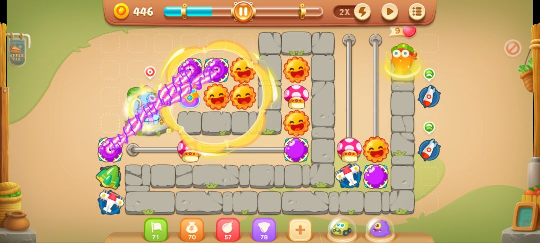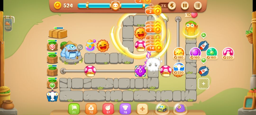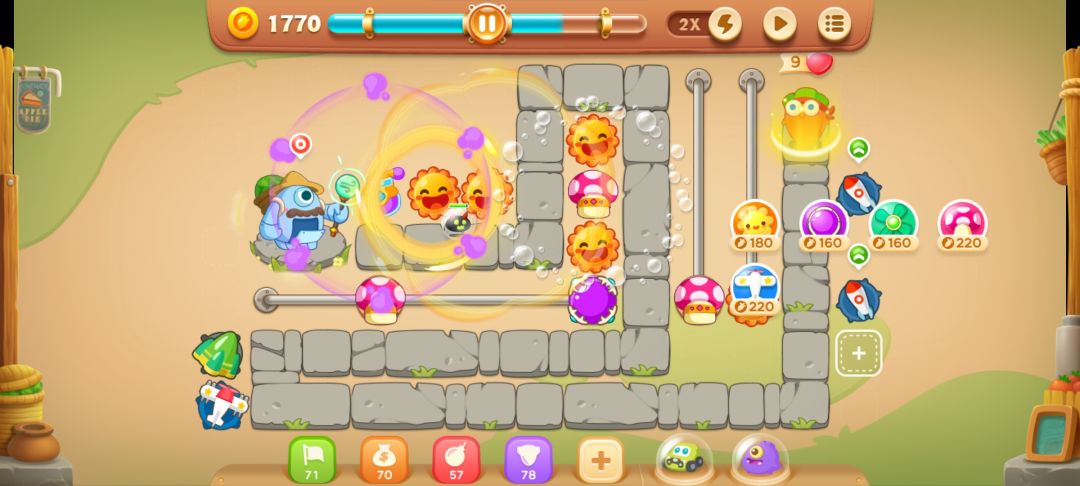 完事儿在太阳旁边放个满级蘑菇,前几波怪就没问题了,左边滑竿放一个满级电塔,拉到最右,清理出上面3格,放个太阳和蘑菇塔,然后继续开左边的障碍物。