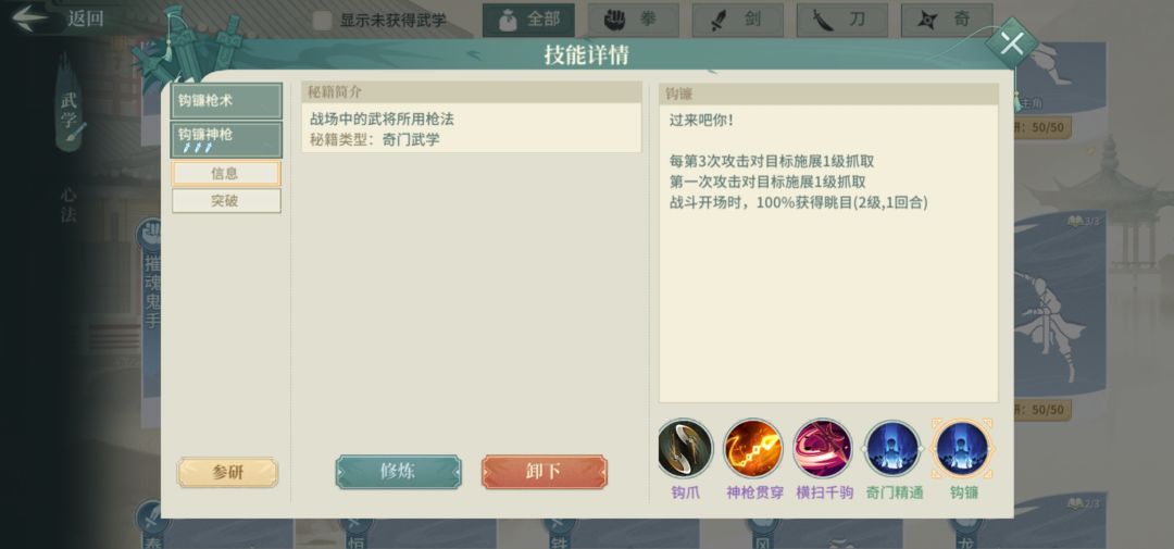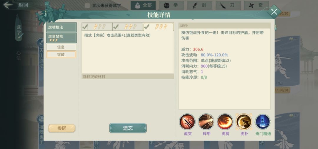 甲见愁枪,鬼枪术(金色)进阶,功能:稳定三连击,需要2突。