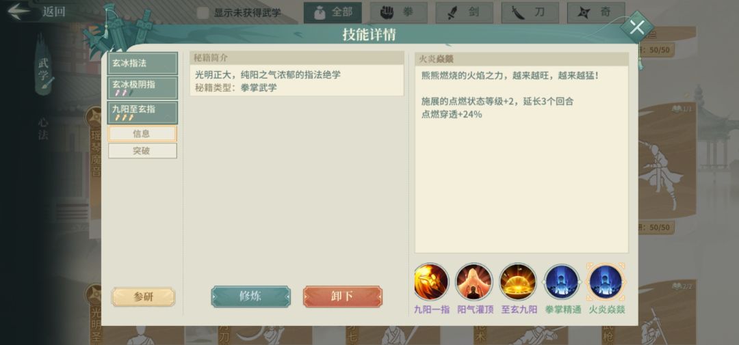 接下来是非必用,但可留用真解介绍,甲九阳指,玄冰指(金色)进阶,功能:加强点燃等级和持续回合,使用的话建议2突及以上。火桃一般会辅修这个。