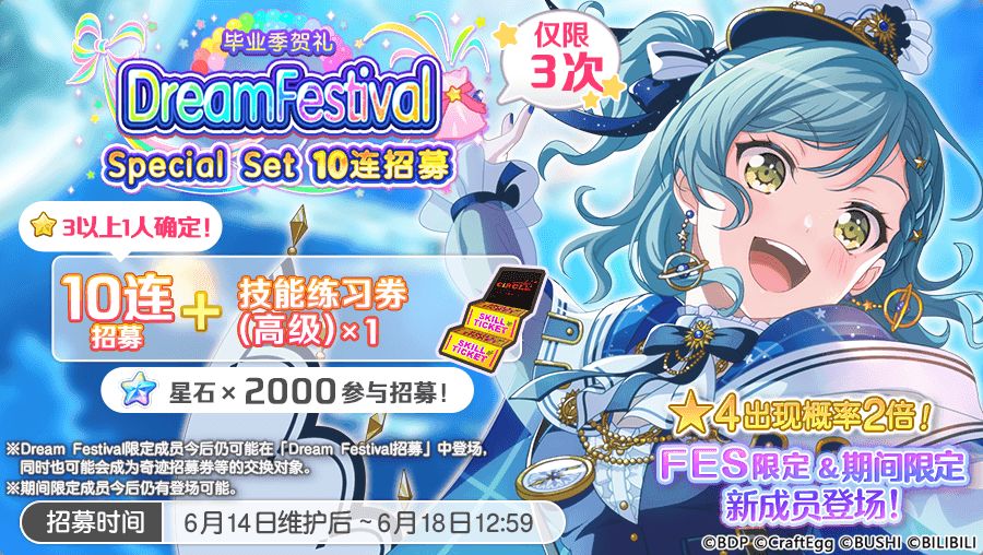 3.「毕业季贺礼Dream Festival Special Set 10连招募」与「毕业季贺礼Dream Festival招募」成员出率一致。