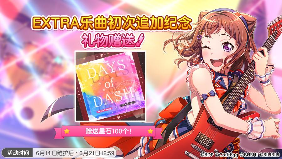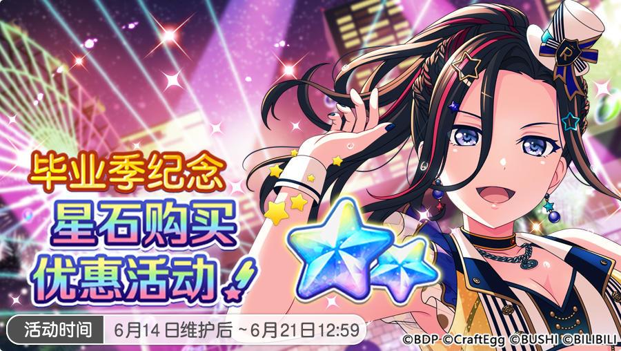 6月14日维护后,游戏内将开启「Feel×Heat×Beat!」竞演演出活动、★4出率双倍的「毕业季贺礼Dream Festival招募」、「毕业季贺礼Dream Festival Special Set 10连」招募以及「毕业季贺礼 ★4初次获得成员1人确定招募」,并追加原创歌曲《灼熱 Bonfire!》和EXTRA歌曲《DAYS of DASH》。同时,游戏内还将开启「Dream Festival开启纪念登录奖励活动」,并赠送「EXTRA乐曲初次追加纪念 特别礼物」,活动期间登录游戏即可获得共计「星石×1100」!此外,游戏内还将开启星石购买优惠活动,并更新「米歇尔贴纸交换所」,可使用米歇尔贴纸兑换第129~130期活动的表情贴纸及活动报酬成员,还请不要错过哦~٩( 'ω' )و
