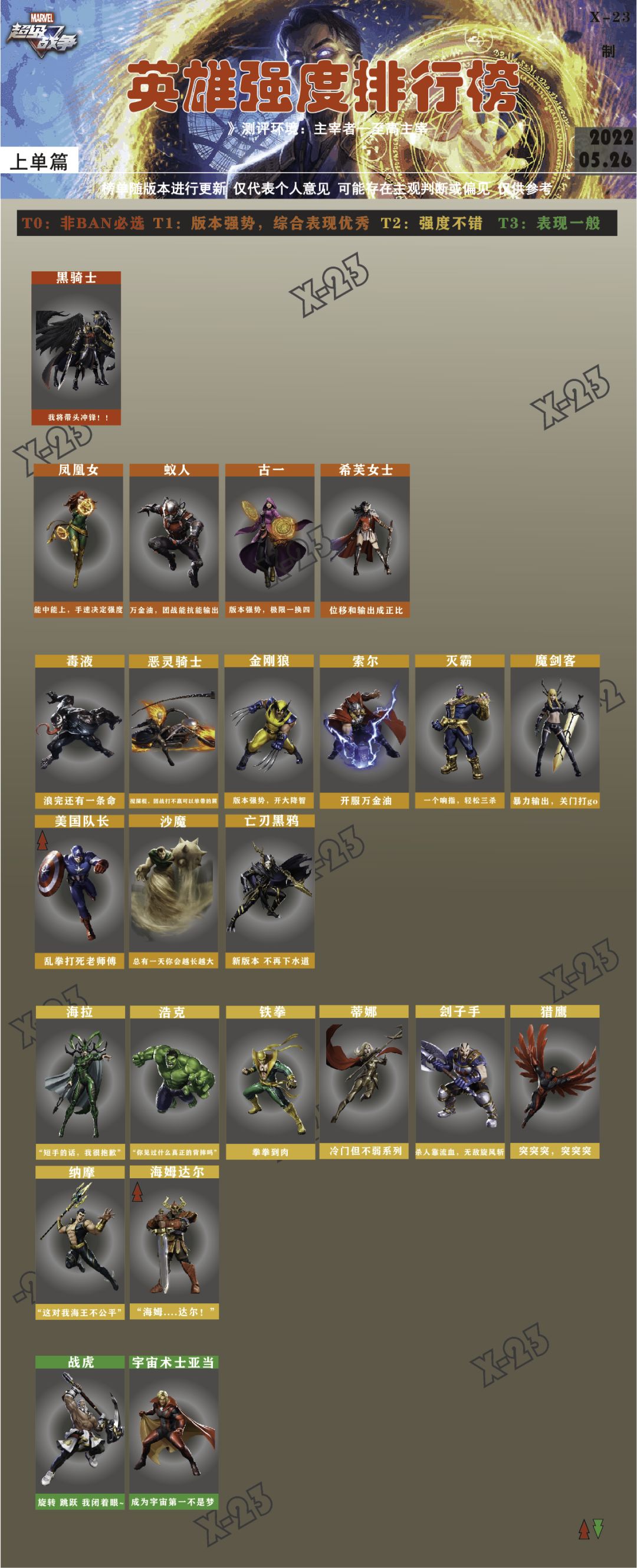 【英雄强度榜】根据游戏数据(存在一定的滞后性),热度以及综合表现等进行定级,但或多或少存在主观因素,仅代表个人观点。如强度榜与各位玩家所喜爱的英雄定级不符,请勿上纲上线。 即使同一个英雄在不同玩家手里也会存在实力差距,T3的英雄在绝活玩家手里依然能打出T1的操作。
