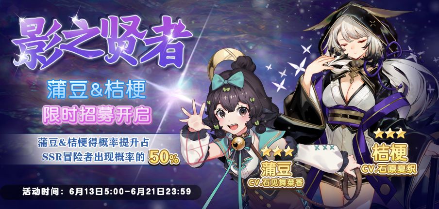 5月14日5:00起#伊甸园的骄傲# 游戏内将开启「影之贤者」限时招募,SSR冒险者「蒲豆」、「桔梗」出现概率占SSR冒险者出现概率的50%,欢迎Leader参与招募~
