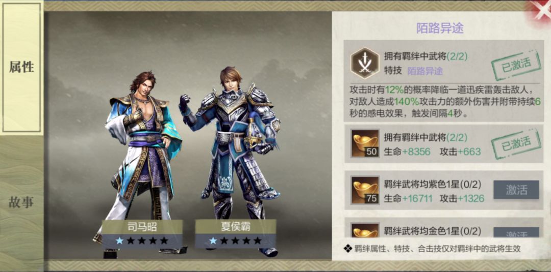 【陌路异途】则是夏侯霸与司马昭的特殊羁绊,能解锁强力的攻击特技,在攻击时有概率召唤疾雷,触发额外伤害与感电效果,进一步提高夏侯霸的控制与输出能力。