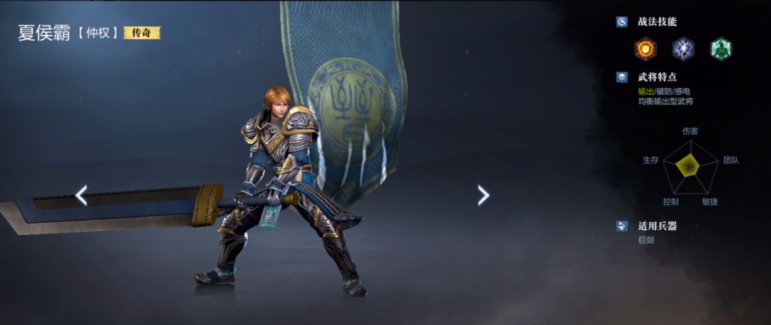 夏侯霸手持巨剑,攻击招式大开大合,作为均衡输出武将,他拥有强大的破防输出能力,同时也有着高防高生命的强韧身板,在各种模式都有着良好的发挥。