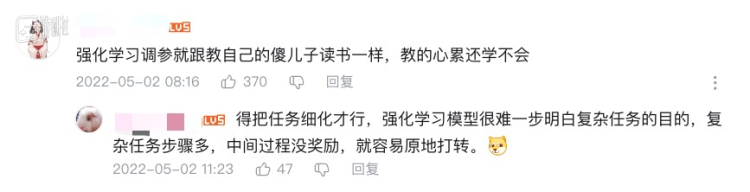 在“网球王子”视频的结尾,小姐姐的摆烂模型终于开始得分了,她表示学算法的乐趣正在于此,不断刷新自己的认识极限。评论区有个用户的评论,我觉得反映了一部分算法工程师的心态:“强化学习调参,就跟教自己傻儿子读书一样,教得心累还学不会。”