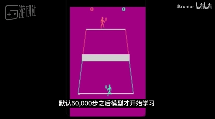 当然也托了人工智能、算法推荐的福,我很快就找到了更多的人工智能摆烂现场。其中最好玩的莫过于这个:《关于我的强化学习模型不收敛这件事》(BV1e5411R7rF)。视频讲述了一个研究自然语言处理(NLP)的小姐姐,如何入坑强化学习的全过程。李Rumor小姐姐使用的游戏是雅达利平台上的《Tennis》,她原本以为能训出地表最强的网球王子——