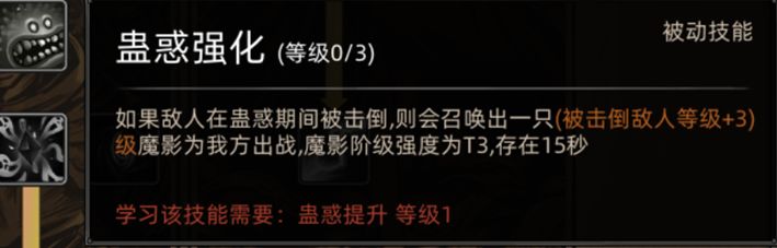 升级[蛊惑强化]这个技能后在[蛊惑]技能时间内击倒敌人则会召唤大于敌人三级的魔影,存在15秒,建议前期进行队伍的招募来弥补心灵女巫的护甲值过低的导致的短板。